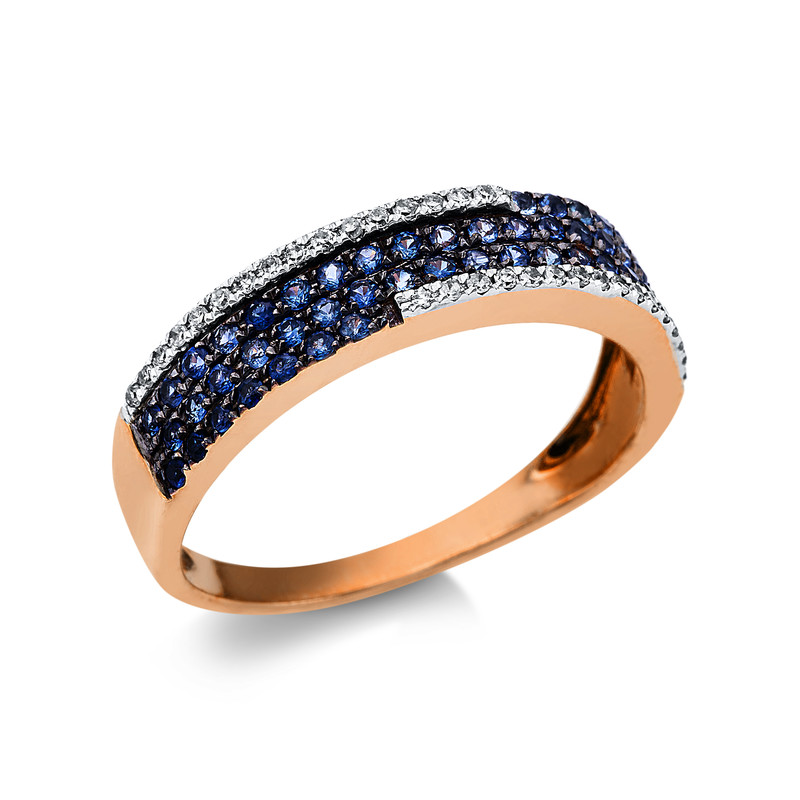 ring 14 kt RG, 32 diamonds 0,12 ct, G-si, 51 sapphire 0,49 ct blue, width:56