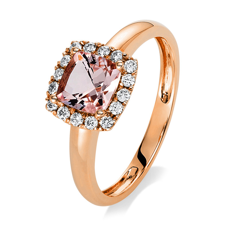 ring 14 kt RG, 16 diamonds 0,16 ct, G-si, 1 morganite 0,90 ct rosé, width:54