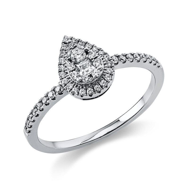 ring 14 kt WG "pear", 1 princess 0,07 ct, G-si, 46 diamonds 0,27 ct, G-si, width:54