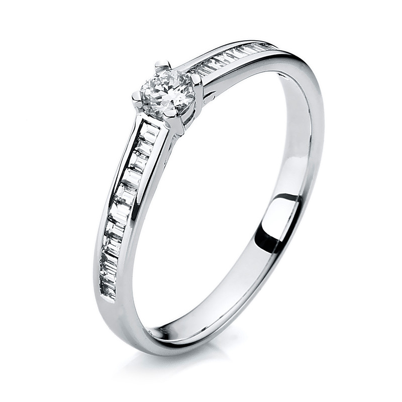 ring 14 kt WG, 1 diamond 0,14 ct, G-si, 22 baguette 0,23 ct, G-si, w:2,5 mm, width:54