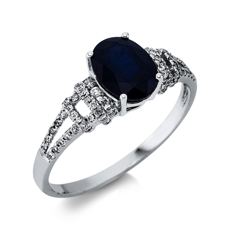 ring 14 kt WG, 66 diamonds 0,22 ct, G-si, 1 sapphire 1,70 ct blue, width:56