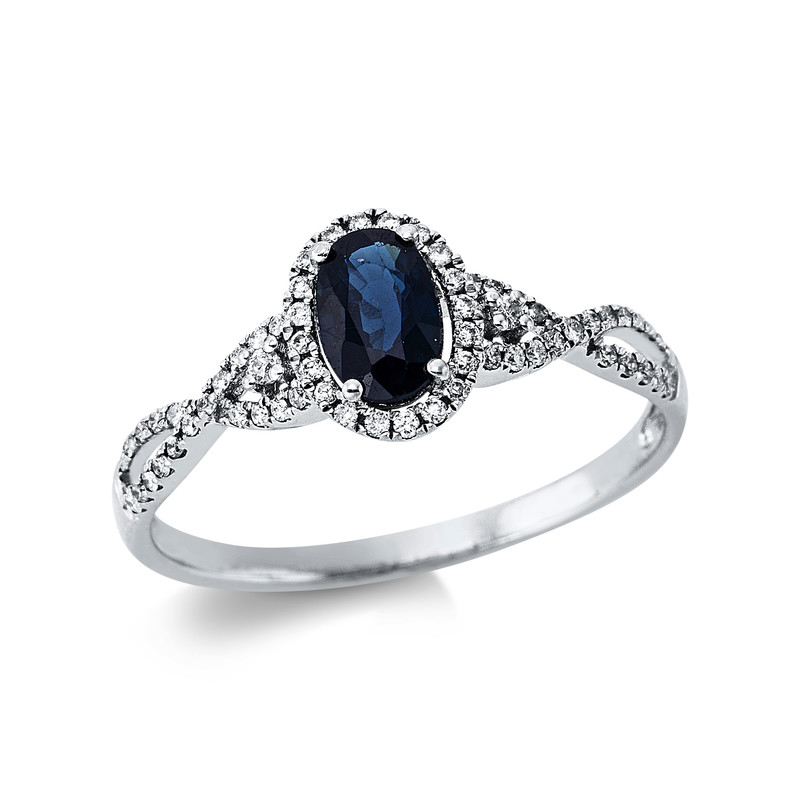 ring 14 kt WG, 62 diamonds 0,18 ct, G-si, 1 sapphire 0,63 ct blue, width:55
