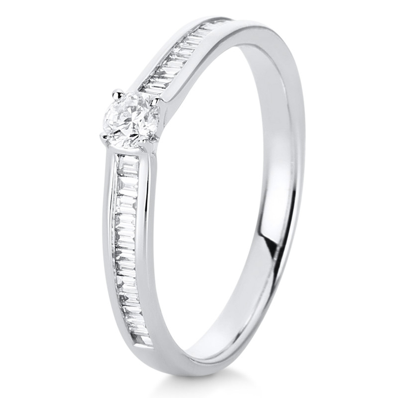ring 14 kt WG, 1 diamond 0,14 ct, G-si, 24 baguette 0,18 ct, G-si, width:52