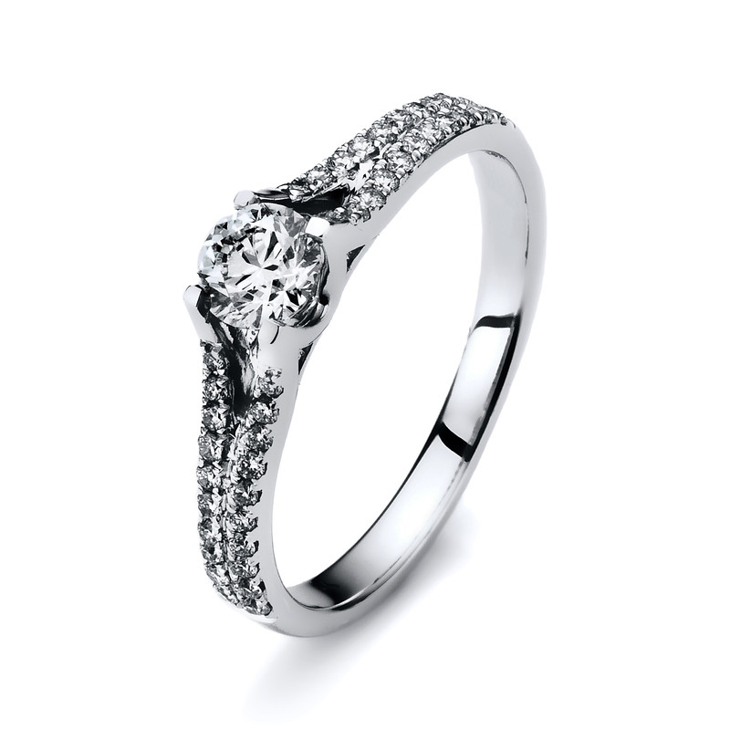 ring 14 kt WG, 1 diamond 0,31 ct, G-si, 40 diamonds 0,20 ct, G-si, w:2,3 mm, width:55