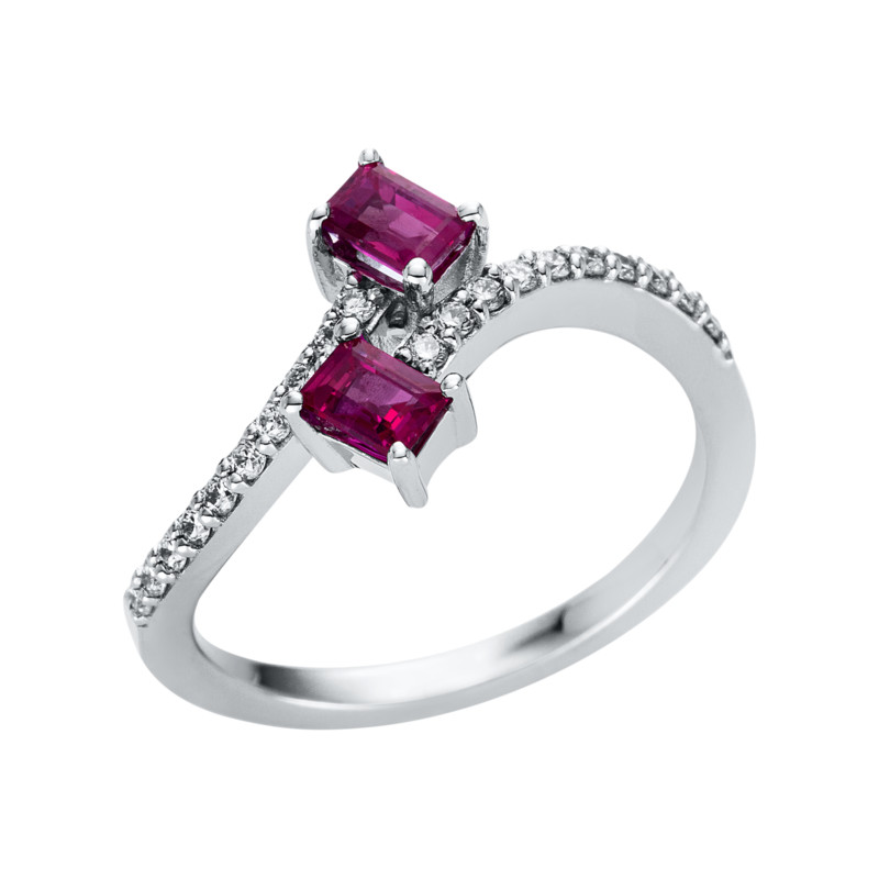 ring 14 kt WG, 20 diamonds 0,17 ct, G-vsi/si, 2 rubies 0,58 ct red, h:8,7 mm, w:10,8 mm, width:52
