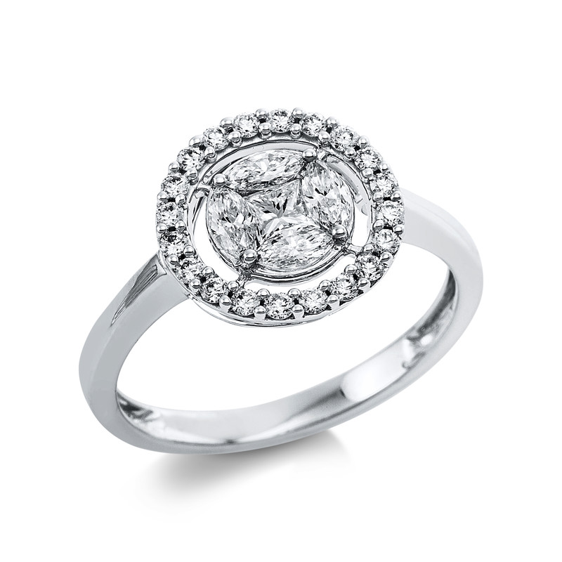 ring 14 kt WG, 4 marquise 0,28 ct, G-si, 1 princess 0,14 ct, G-si, 20 diamonds 0,23 ct, G-si, width:54