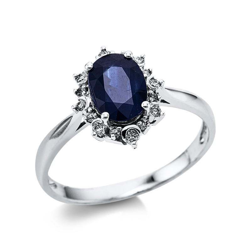 ring 14 kt WG, 16 diamonds 0,12 ct, G-si, 1 sapphire 1,59 ct blue, width:56