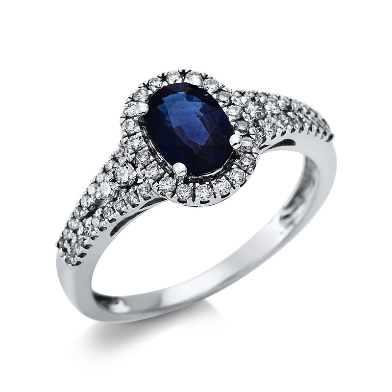 ring 14 kt WG, 60 diamonds 0,32 ct, G-si, 1 sapphire 1,11 ct blue, width:54