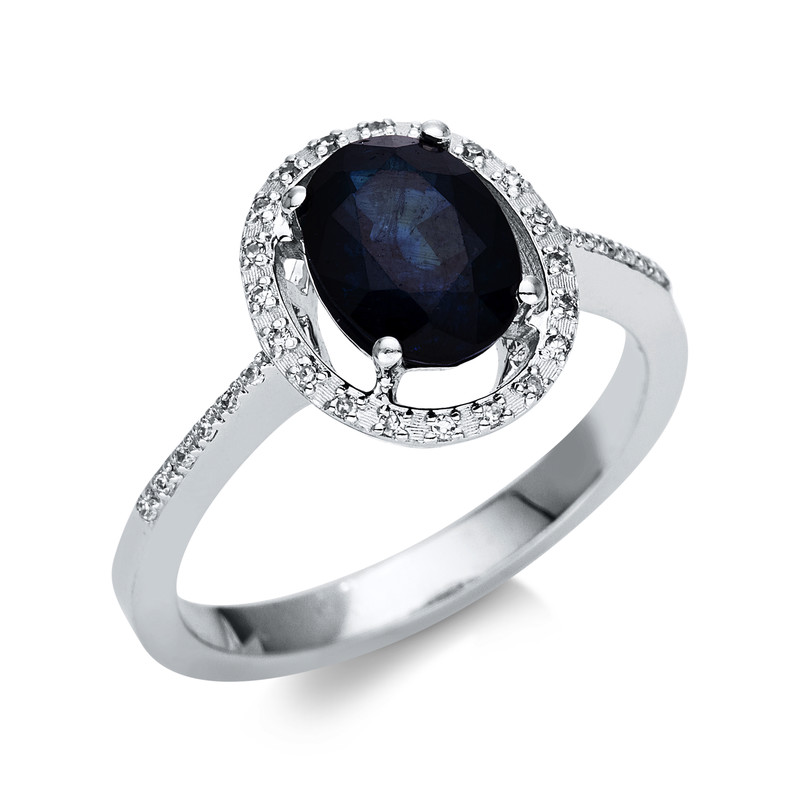 ring 14 kt WG, 32 diamonds 0,07 ct, H-vsi/si, 1 sapphire 1,60 ct blue, width:50