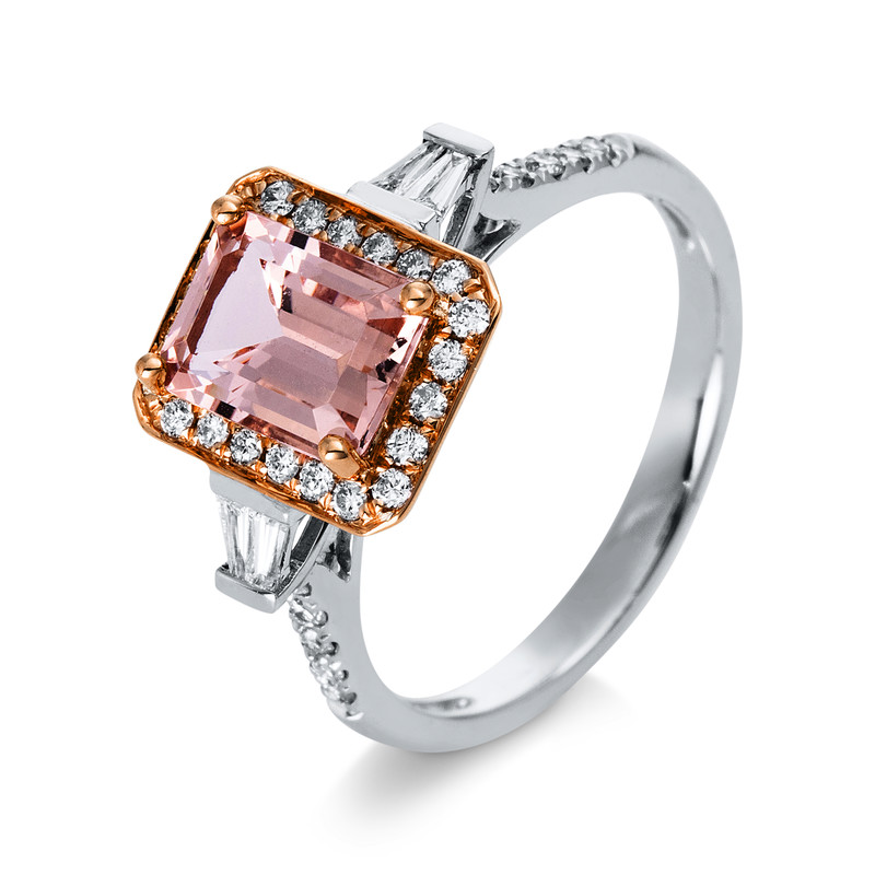 ring 14 kt WG+RG, 4 baguette 0,10 ct, G-si, 32 diamonds 0,28 ct, G-si, 1 morganite 1,40 ct rosé, h:8,9 mm, w:10,6 mm, width:54