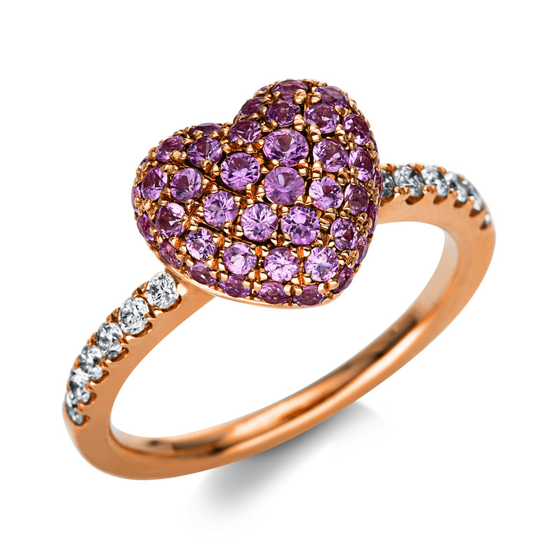 ring 18 kt RG "heart", 21 diamonds 0,22 ct, G-vsi/si, 48 sapphire 0,86 ct pink, width:54