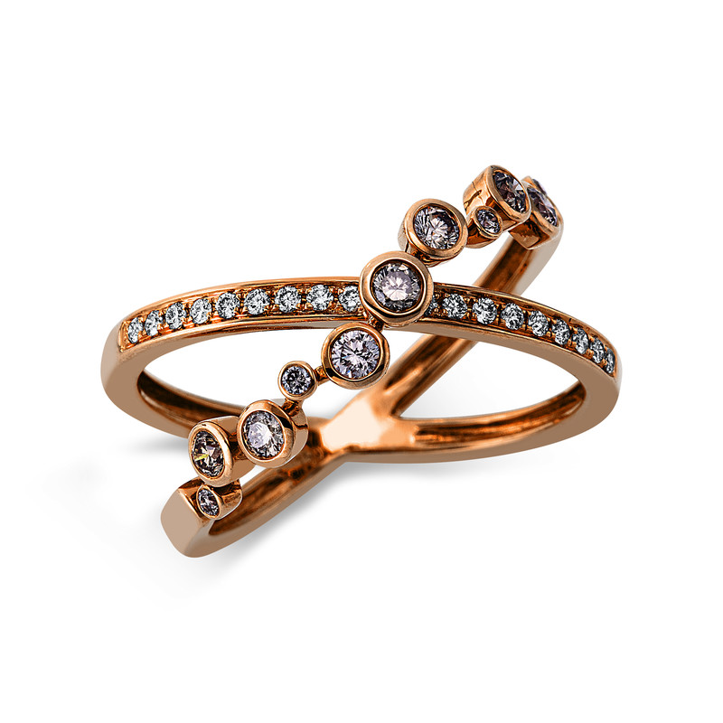 ring 18 kt RG, 18 diamonds 0,11 ct, G-si, 11 diamonds 0,30 ct, brown, w:10,0 mm, width:53
