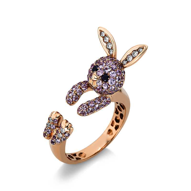 ring 18 kt RG, 12 diamonds 0,10 ct, G-vsi, 2 diamonds 0,05 ct, black, 87 sapphire 1,07 ct pink, h:30,0 mm, w:13,8 mm, width:53