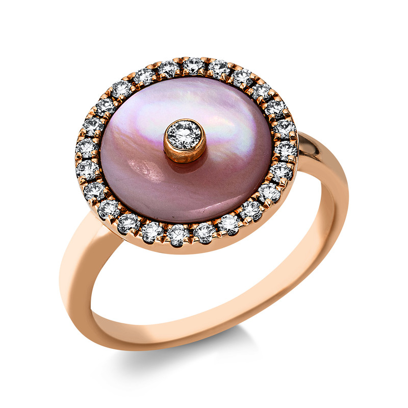 ring 18 kt RG, 1 diamond 0,04 ct, G-si, 24 diamonds 0,28 ct, G-si, 1 MOP 1,62 ct pink, width:52