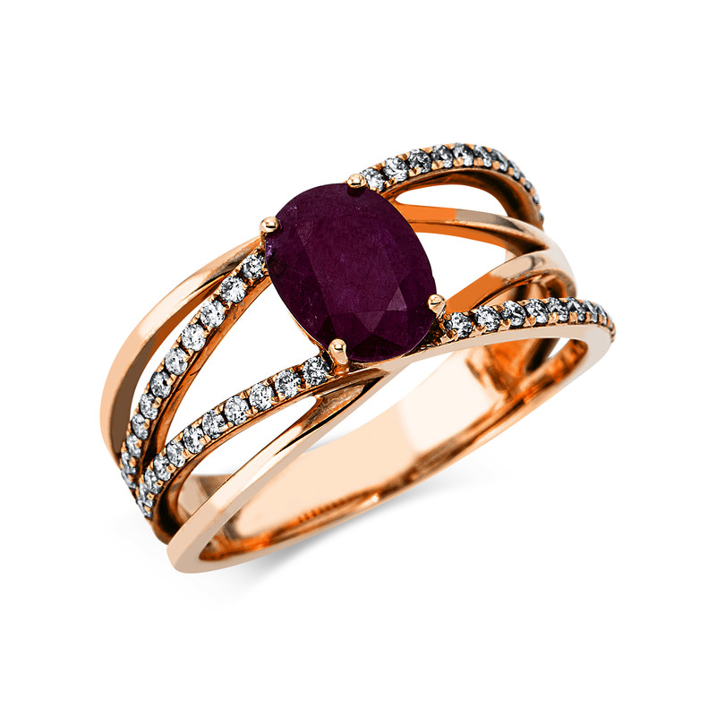 ring 18 kt RG, 44 diamonds 0,29 ct, G-si, 1 ruby 1,52 ct red, width:56