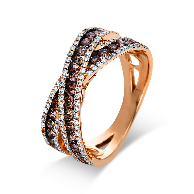 ring 18 kt RG, 114 diamonds 0,43 ct, G-si, 28 diamonds 1,25 ct, brown, w:8,9 mm, width:54
