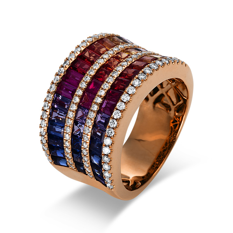 ring 18 kt RG, 98 diamonds 0,59 ct, G-si, 43 sapphire 3,81 ct fancy, w:13,3 mm, width:53