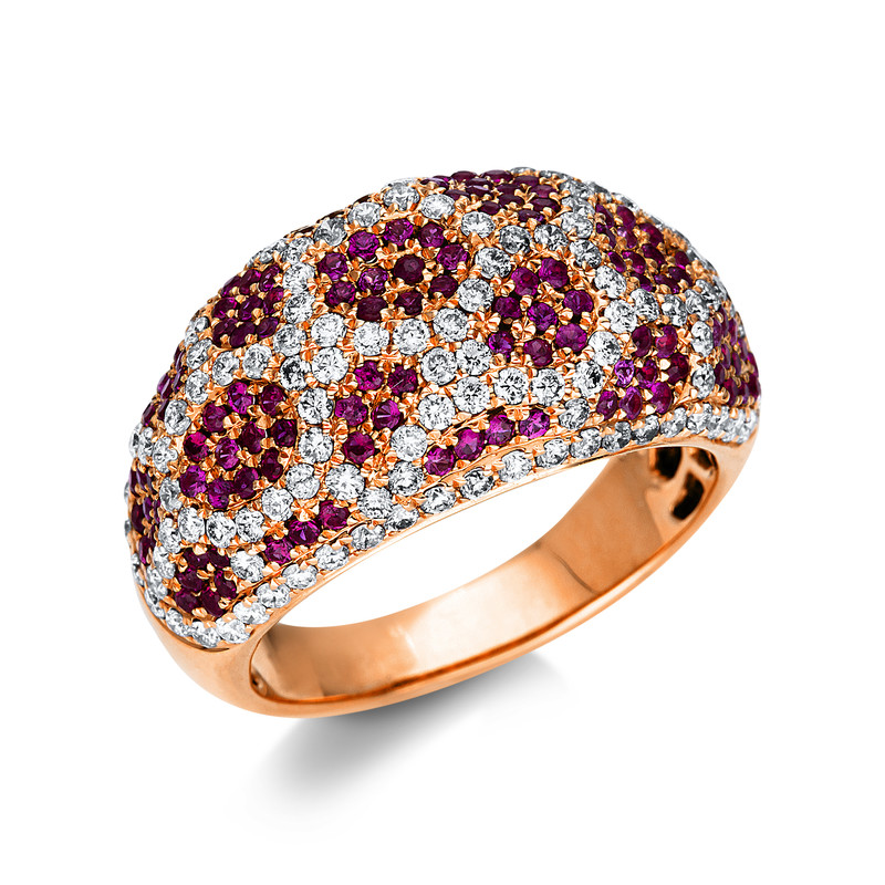 ring 18 kt RG, 135 diamonds 1,11 ct, G-si, 137 rubies 0,86 ct red, width:54
