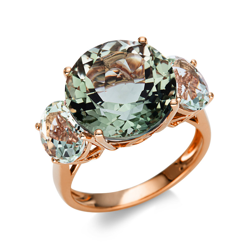 ring 18 kt RG, 1 amethyst 6,50 ct green, 2 amethysts 2,20 ct green, width:54