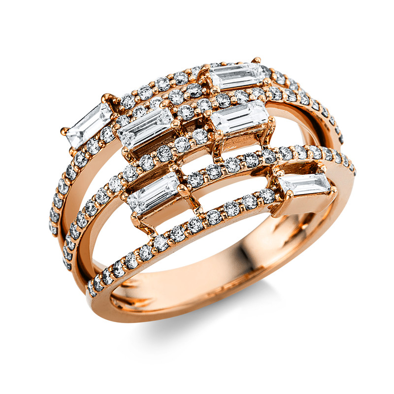 ring 18 kt RG, 6 baguette 0,40 ct, G-vsi/si, 78 diamonds 0,54 ct, G-vsi/si, w:13,6 mm, width:53