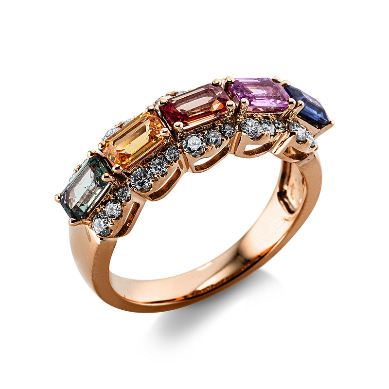 ring 18 kt RG, 10 diamonds 0,13 ct, G-si, 10 diamonds 0,06 ct, G-si, 10 diamonds 0,25 ct, G-si, 5 sapphire 1,69 ct multicolor, width:54