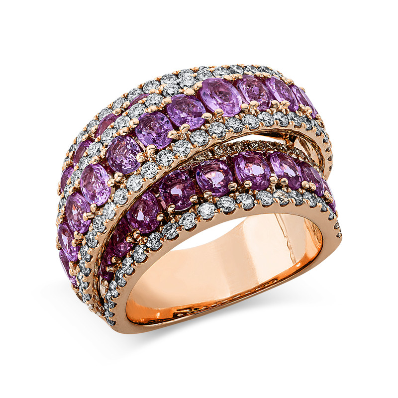 ring 18 kt RG, 123 diamonds 1,77 ct, G-vsi, 32 sapphire 6,50 ct pink, width:54
