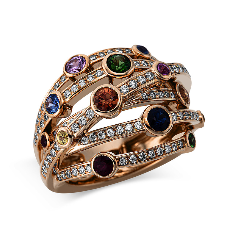 ring 18 kt RG, 109 diamonds 0,72 ct, G-vsi, 13 sapphire 1,35 ct multicolor, width:53