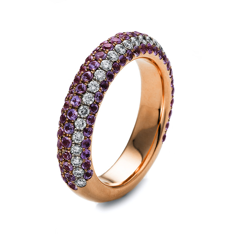 ring 18 kt RG, 28 diamonds 0,44 ct, G-vsi/si, 111 sapphire 2,19 ct pink, width:56