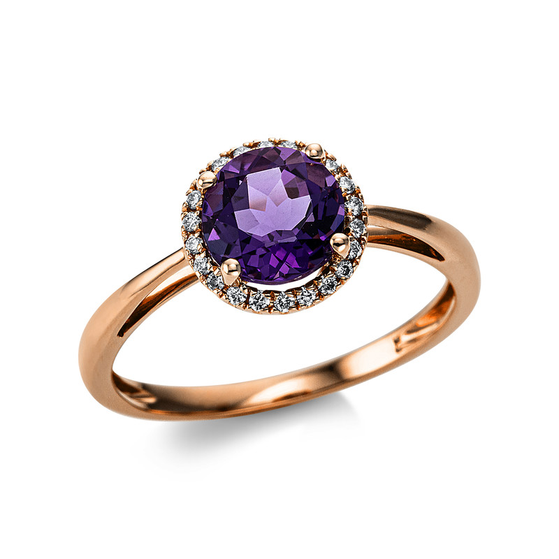 ring 18 kt RG, 22 diamonds 0,10 ct, G-si, 1 amethyst 1,30 ct, h:8,9 mm, w:8,9 mm, width:54