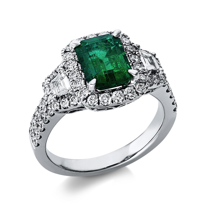 ring 18 kt WG, GRS2019-086583, 2 fanta cut 0,24 ct, G-si, 56 diamonds 0,90 ct, G-si, 1 emerald 2,10 ct green, width:54