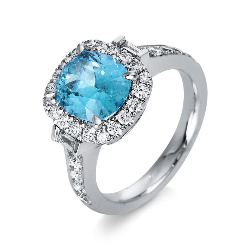 ring 18 kt WG, GRS2020-048150, 2 baguette 0,14 ct, G-si, 30 diamonds 0,84 ct, G-si, 1 paraiba 2,73 ct turquoise, width:54