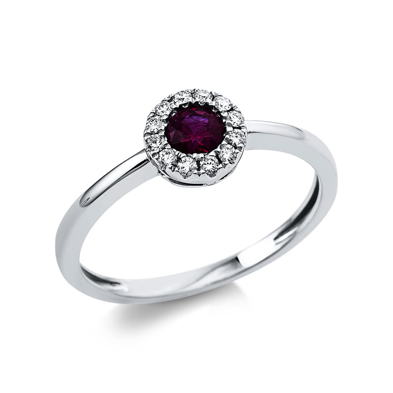 ring 18 kt WG "circle", 12 diamonds 0,11 ct, G-si, 1 ruby 0,26 ct red, Ø:6,5 mm, width:54
