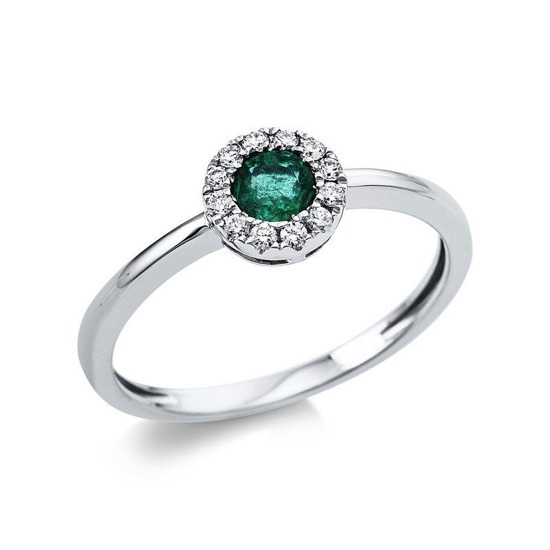 ring 18 kt WG "circle", 12 diamonds 0,11 ct, G-si, 1 emerald 0,24 ct green, h:6,6 mm, w:6,5 mm, width:54