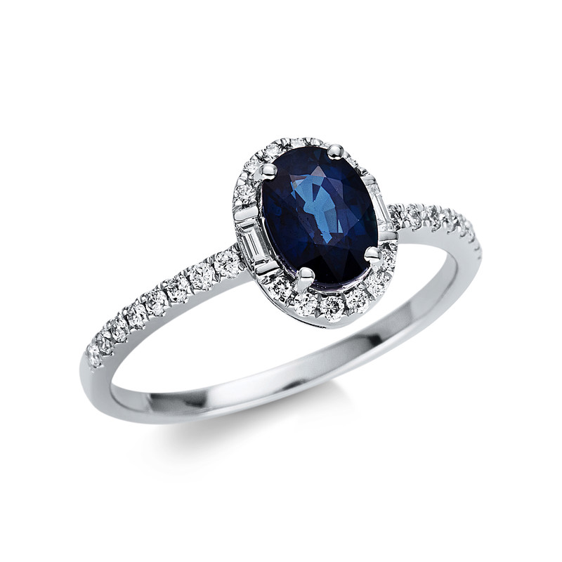 ring 18 kt WG "oval", 28 diamonds 0,18 ct, G-si, 2 baguette 0,04 ct, G-si, 1 sapphire 1,05 ct blue, width:54