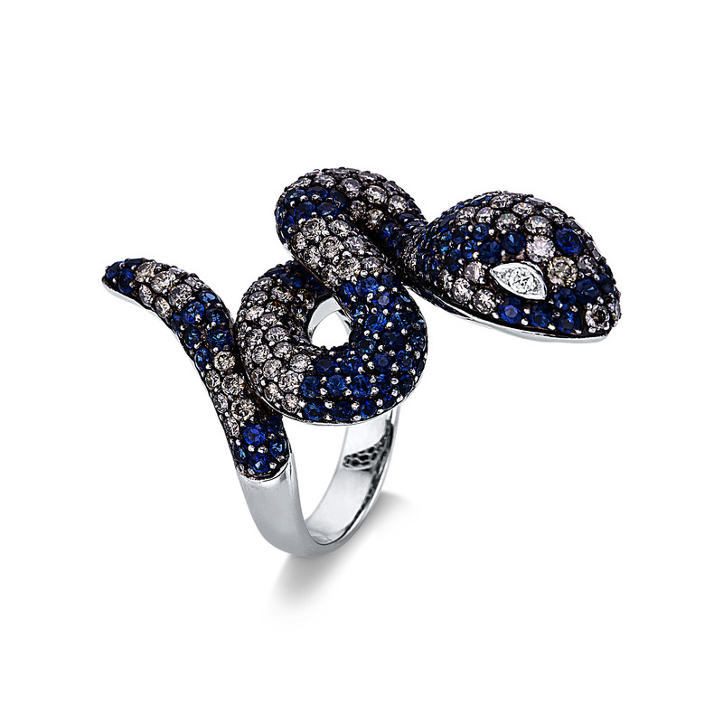 ring 18 kt WG "snake", setting black rhodium plated, 2 diamonds 0,04 ct, G-vsi/si, 112 diamonds 2,53 ct, brown, 127 sapphire 3,28 ct blue, width:54