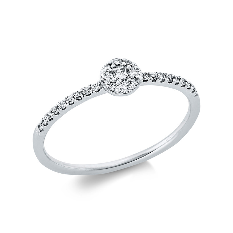 ring 18 kt WG, 22 diamonds 0,08 ct, G-si, 1 princess 0,04 ct, G-si, 4 diamonds 0,04 ct, G-si, width:54