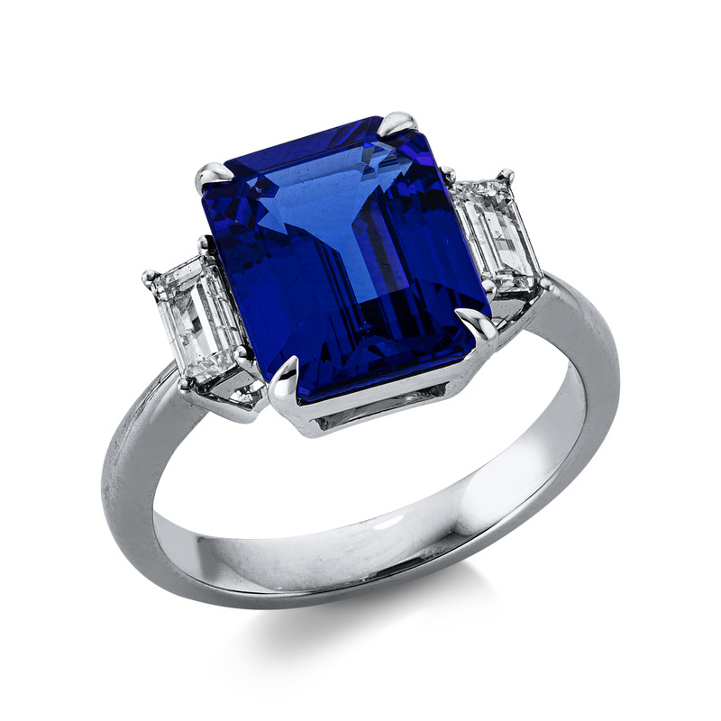 ring 18 kt WG, 2 baguette 0,51 ct, G-si, 1 tanzanite 4,68 ct blue, width:54