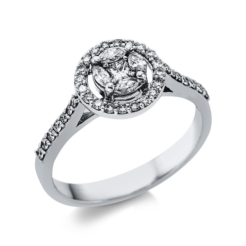 ring 18 kt WG, 1 princess 0,08 ct, G-vsi/si, 4 marquise 0,15 ct, G-vsi/si, 34 diamonds 0,27 ct, G-vsi/si, width:53