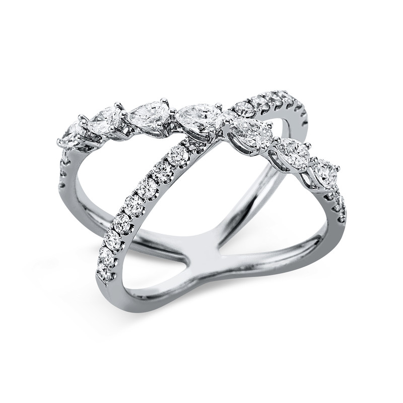 ring 18 kt WG, 7 pear 0,54 ct, G-vsi, 24 diamonds 0,45 ct, G-vsi, width:52