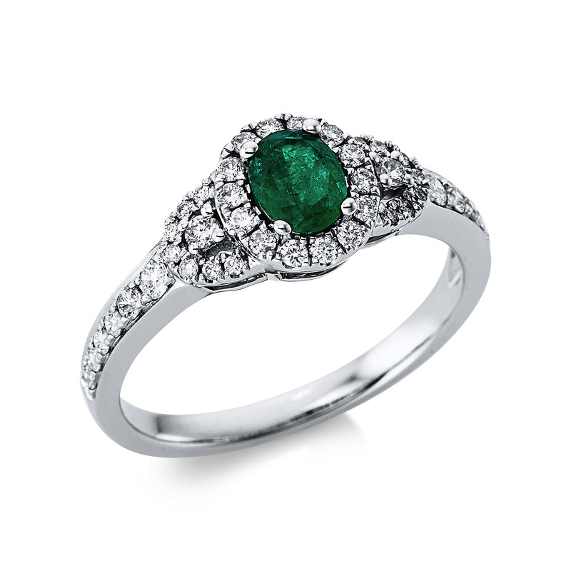 ring 18 kt WG, 42 diamonds 0,38 ct, G-si, 1 emerald 0,39 ct green, width:54