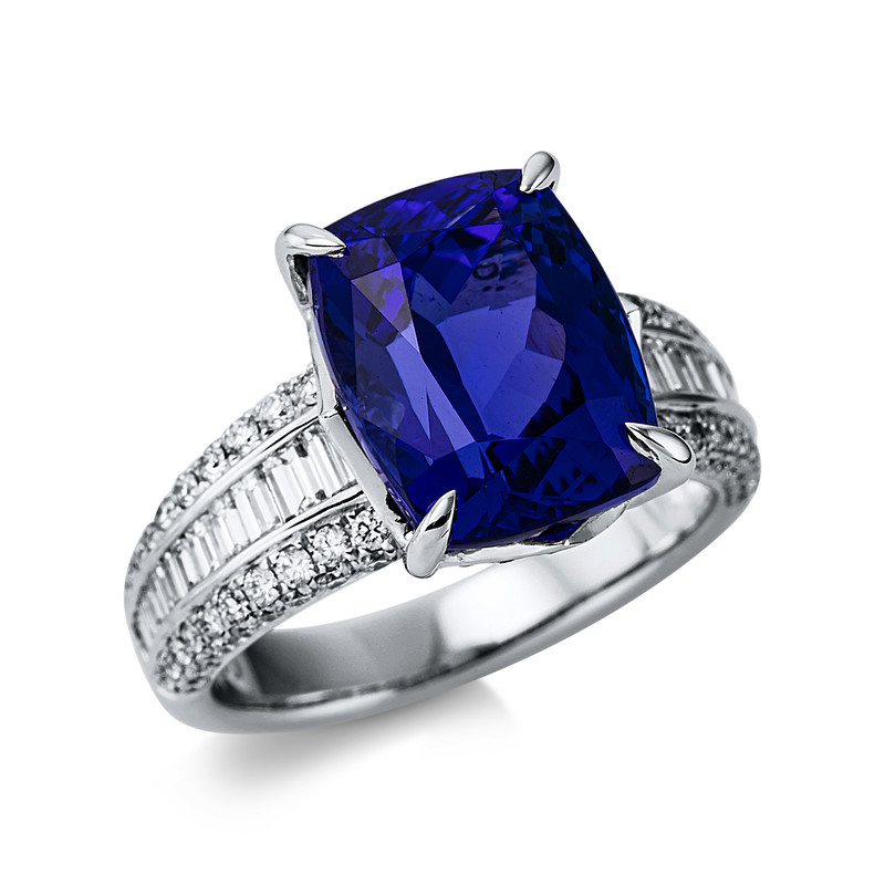 ring 18 kt WG, 20 baguette 0,63 ct, G-vsi, 106 diamonds 0,63 ct, G-vsi, 1 tanzanite 7,67 ct blue, width:54