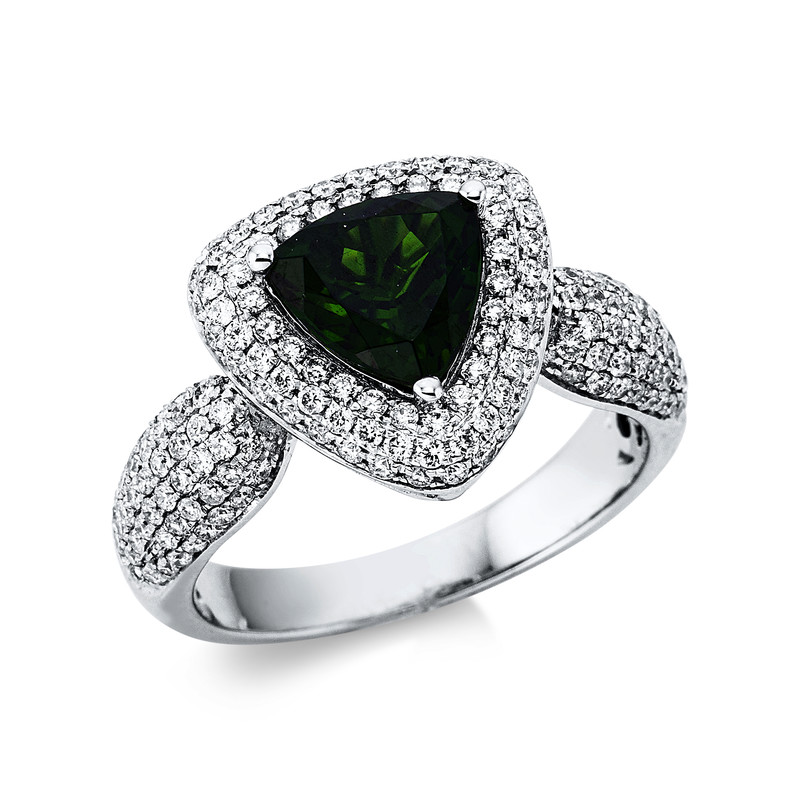 ring 18 kt WG, 194 diamonds 1,05 ct, G-si, 1 diopside 1,93 ct green, width:57