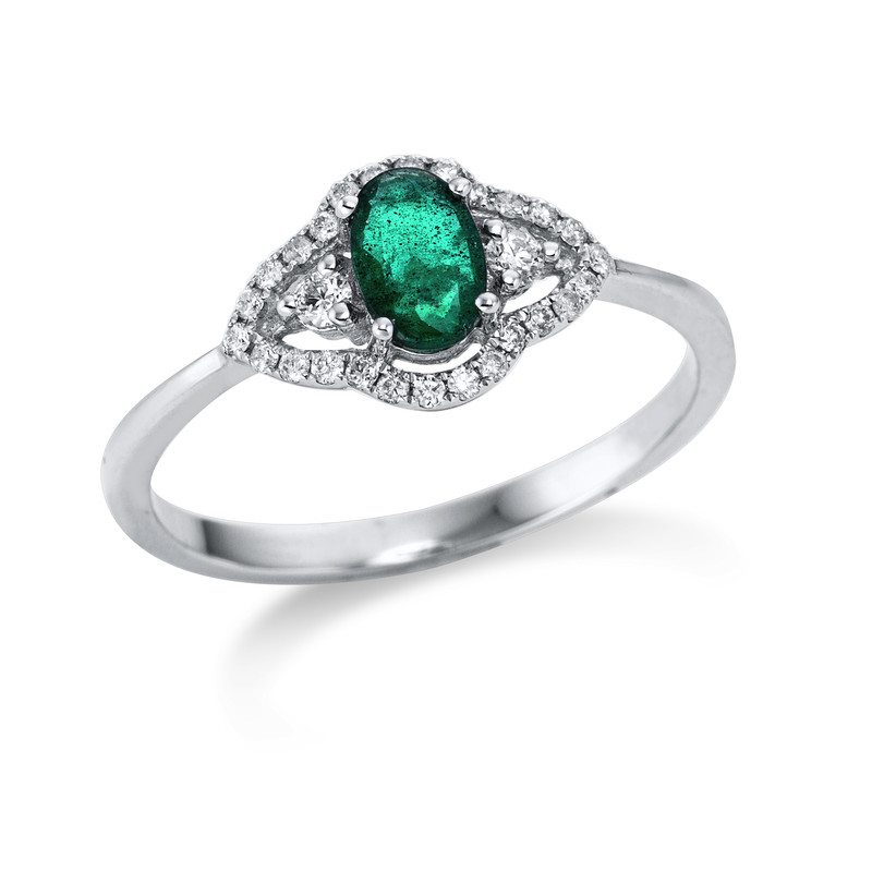 ring 18 kt WG, 28 diamonds 0,17 ct, G-si, 1 emerald 0,44 ct green, width:56