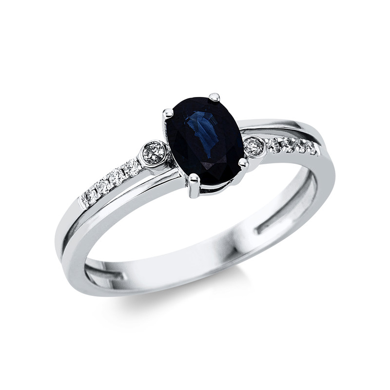 ring 18 kt WG, 10 diamonds 0,09 ct, G-si, 1 sapphire 1,08 ct blue, width:57