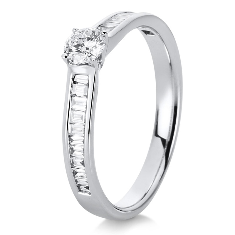 ring 18 kt WG, 1 diamond 0,25 ct, G-si, 24 baguette 0,24 ct, G-si, width:54