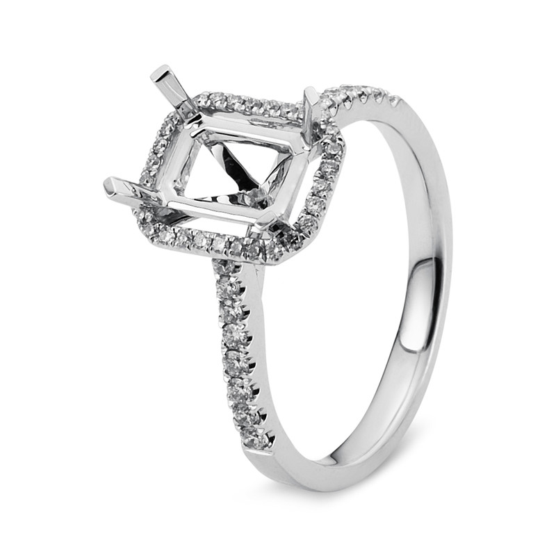 ring 18 kt WG, 46 diamonds 0,27 ct, G-vsi/si, mounting for 1x em.cut 6x8 mm, width:53