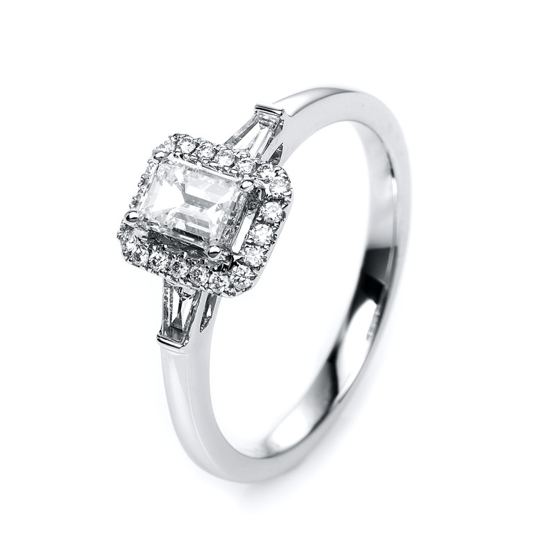 ring 18 kt WG, 2 baguette 0,11 ct, G-si, 1 em.cut 0,52 ct, G-si, 20 diamonds 0,11 ct, G-si, width:54