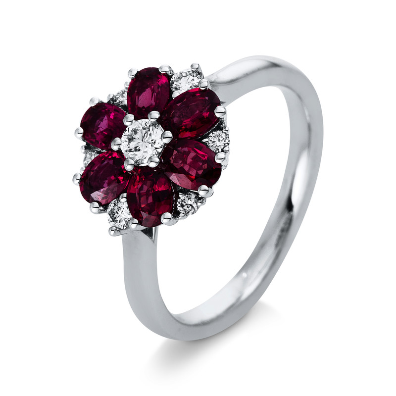 ring 18 kt WG, 7 diamonds 0,23 ct, G-si, 6 rubies 1,35 ct red, width:53