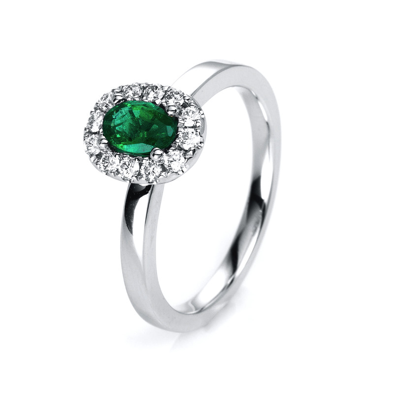 ring 18 kt WG, 12 diamonds 0,22 ct, G-vsi, 1 emerald 0,39 ct green, width:54
