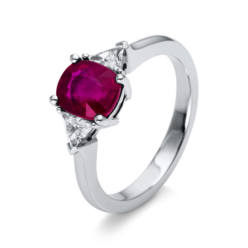 ring 18 kt WG, 2 triangle 0,27 ct, G-vsi, 1 ruby 2,02 ct red, width:54